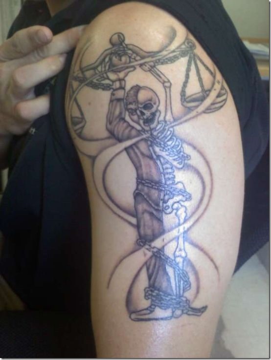 Bras enchaînés moitié humain moitié squelette balance échelle de tatouage